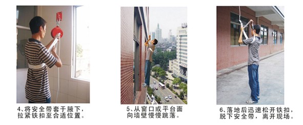 (2) 將******帶套入逃生者適當(dāng)位置,并拉緊滑動扣,準(zhǔn)備跳落。